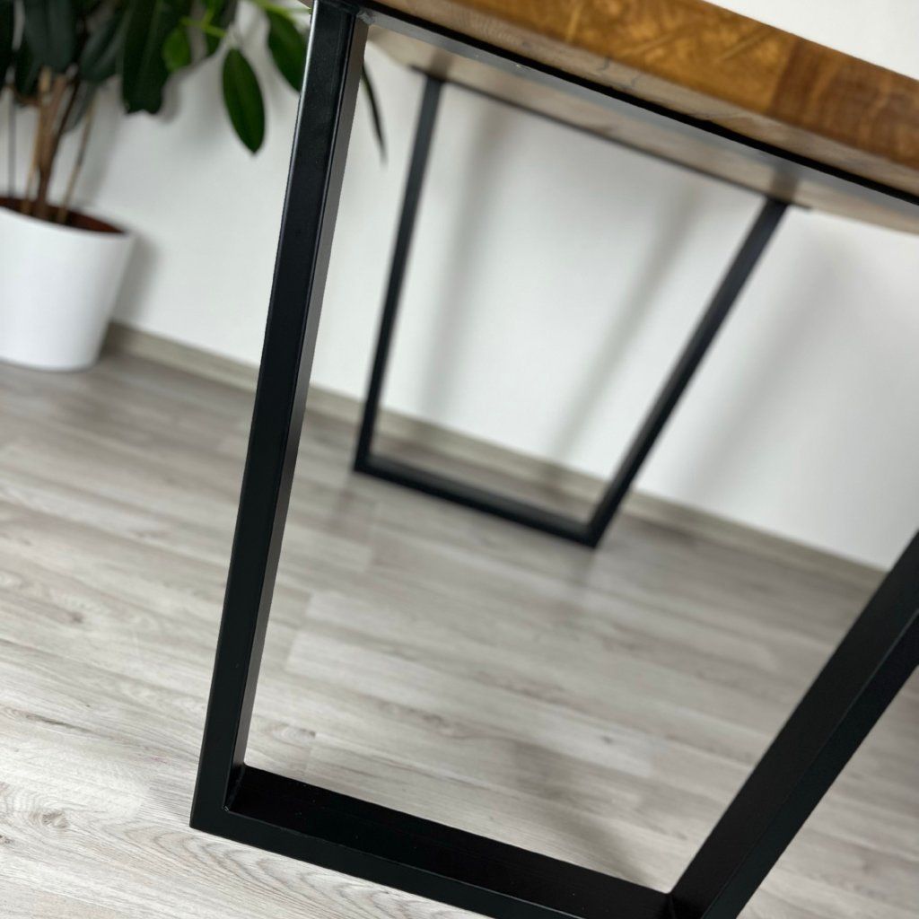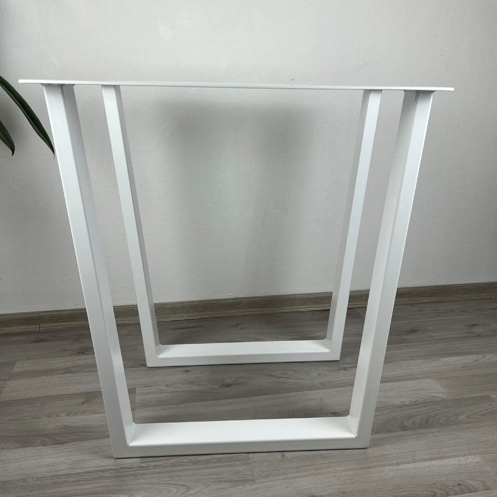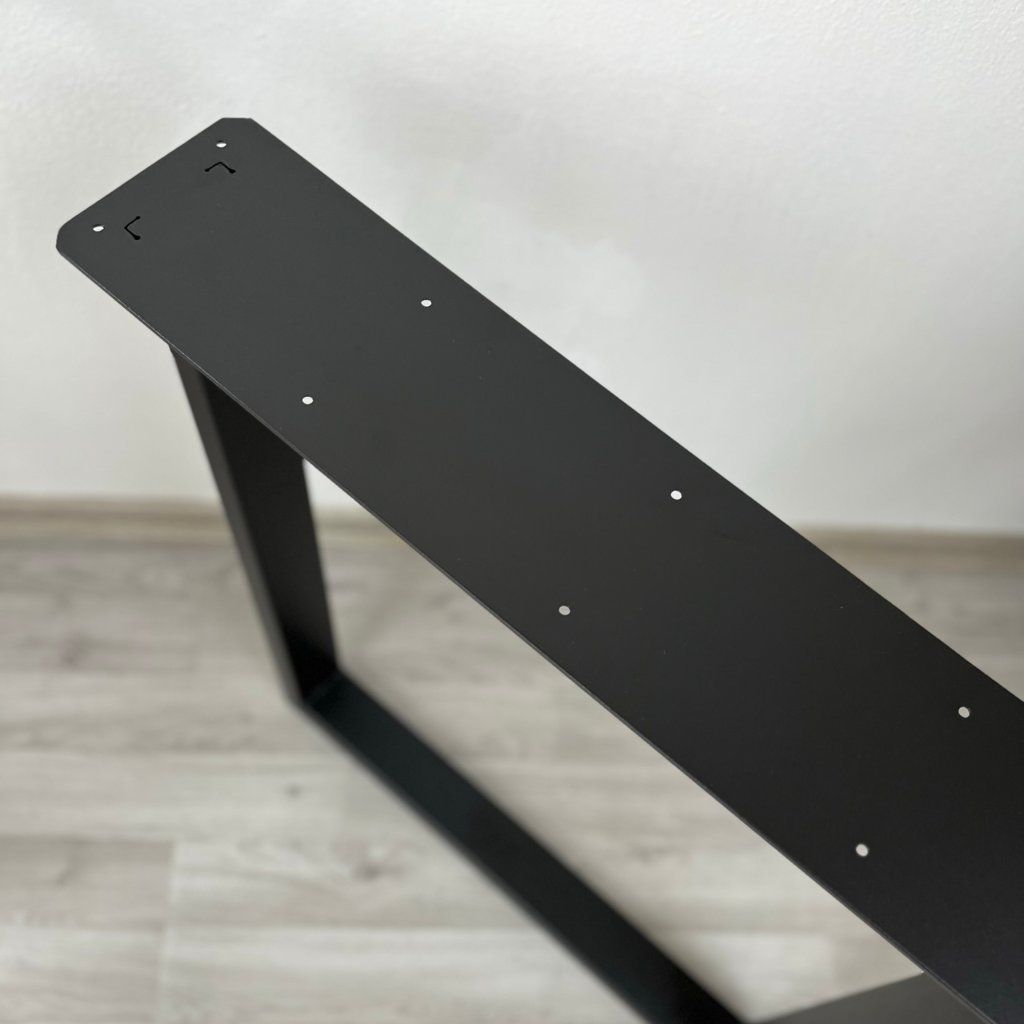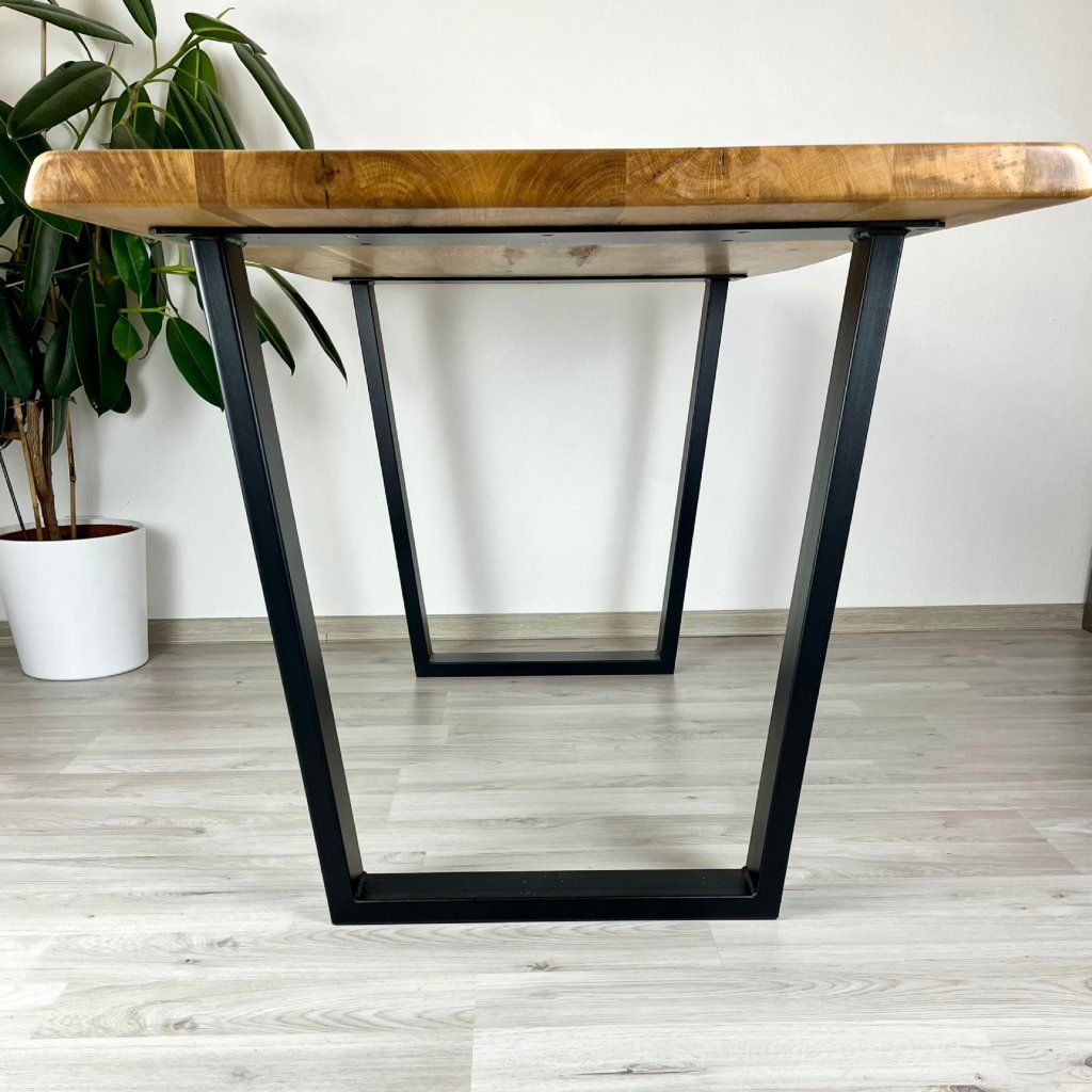 Kovová podnož s mírně zkosenými stranami do tvaru písmene V lze připevnit k jakékoliv desce z masivu nebo lamina. Pro své rozložení nohou je ideální jak na jídelní stůl, tak na pracovní stůl.